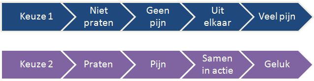 Bij je eigen angst aankijken of bij moeilijke gesprekken met je partner is het niet anders. Kijk -even zwart-wit gesteld- maar naar deze 2 verschillende keuzes en het eindresultaat: